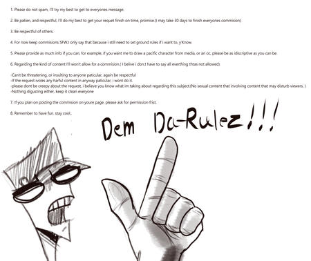Read the Rules thoroughly, And then, wait for response through Gmail and then we'll communicate through my discord for updates, and my discord name is "rjrosa8919" (Note, I may notify you that your commission was not accepted, but I ensure you won't have to worry about that.)